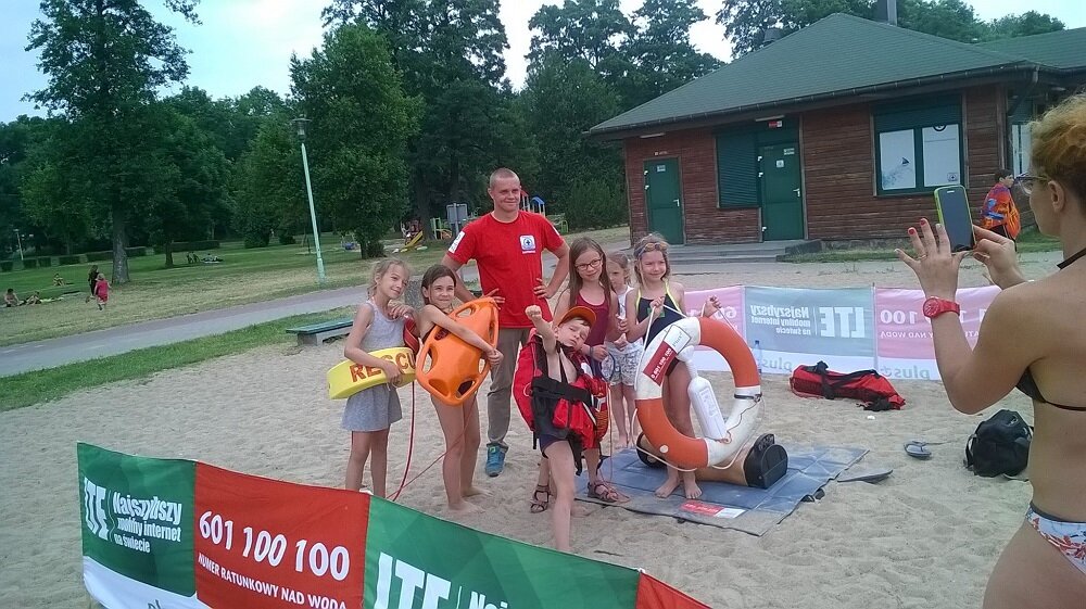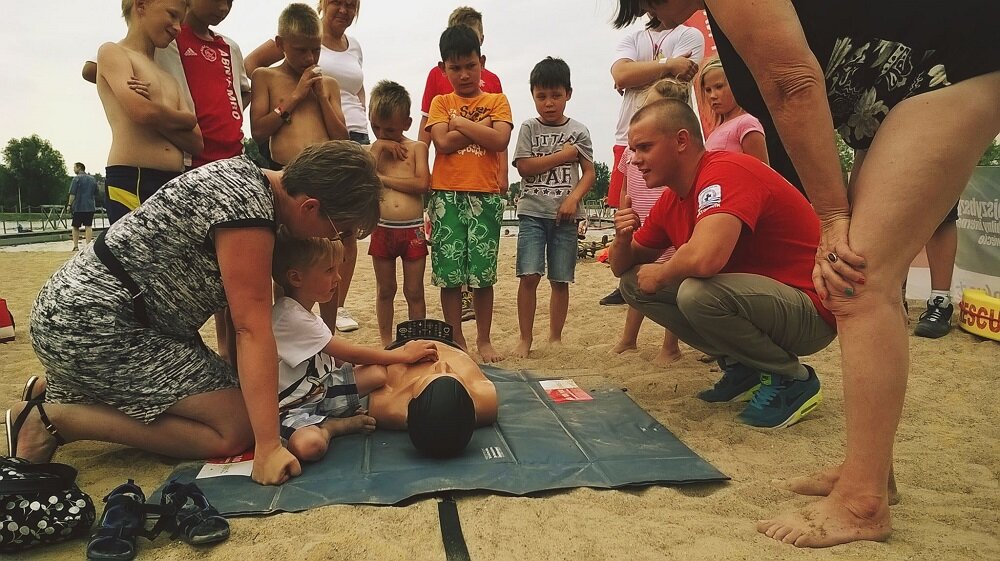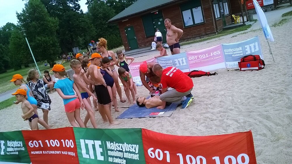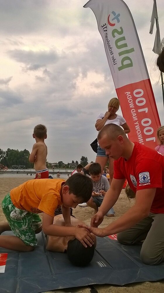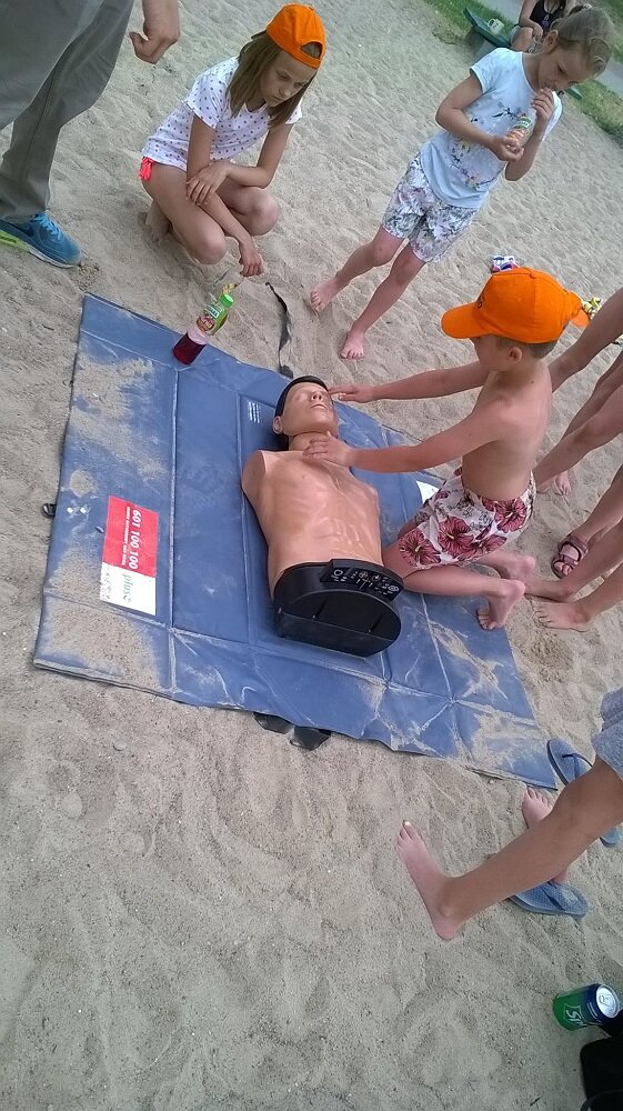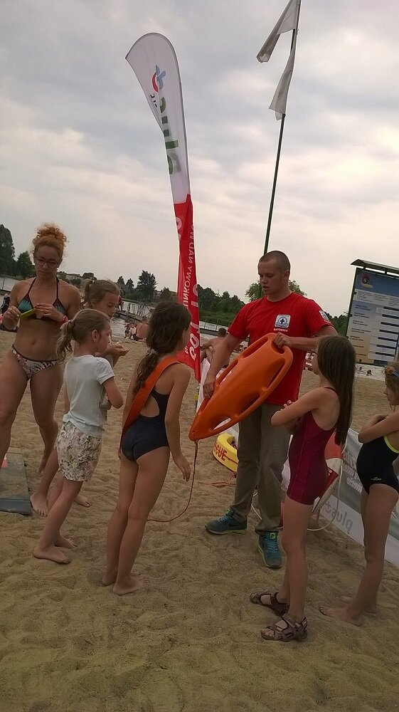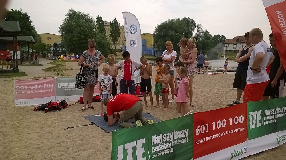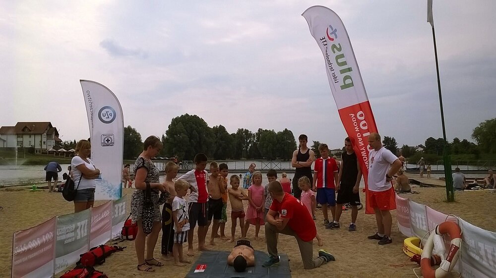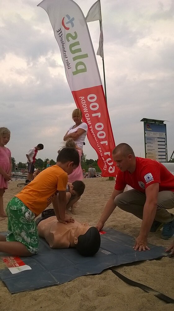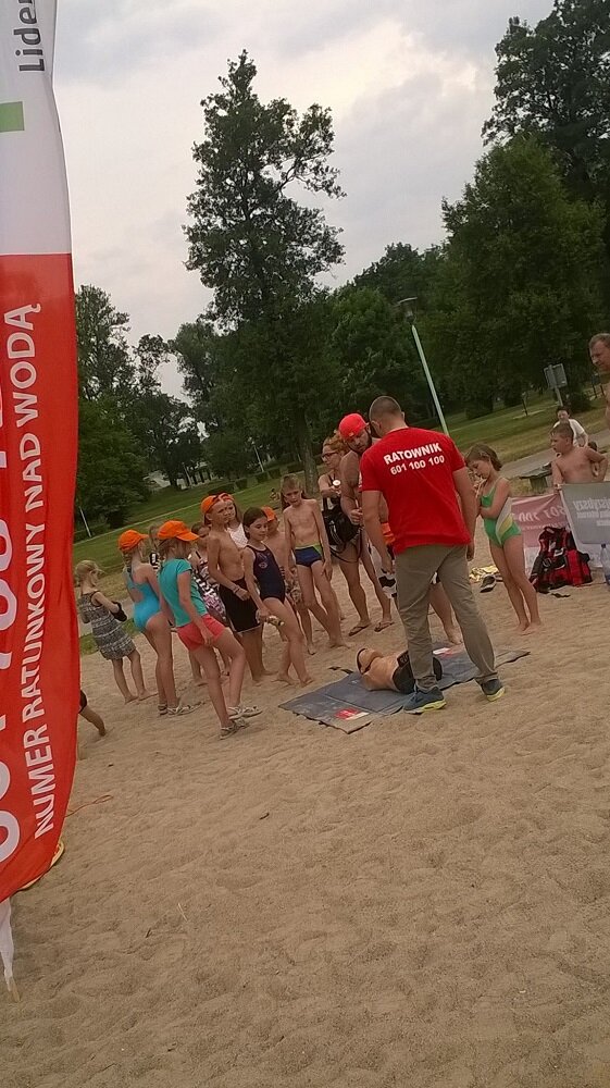 06.07. 2015 r. ratownicy wodni suwalskiego WOPR na kąpielisku Zalewu Arkadia prowadzili działania prewencyjne dotyczące bezpieczeństwa nad wodą. Przeprowadzili szkolenie z posługiwania się sprzętem używanym w ratownictwie wodnym oraz w jaki sposób udzielamy pierwszej pomocy przedlekarskiej – ćwiczenia na fantomie do resuscytacji.